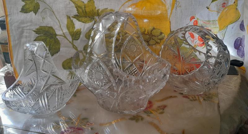 хрустальные 3 вазы с ручкой.Одна большая,2га меньше и 3я еще меньше