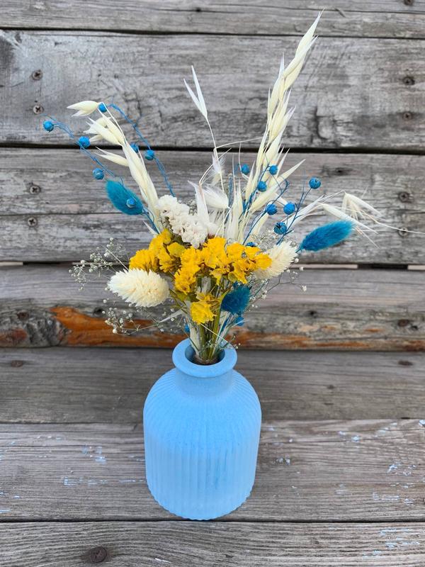 Стильная композиция в желто-голубой гамме, которая добавляет яркости и свежести любому интерьеру. Идеально подходит для декора дома, офиса или в качестве оригинального подарка. Каждый букет изготовлен вручную с любовью и вниманием к деталям. Ваза + букетик