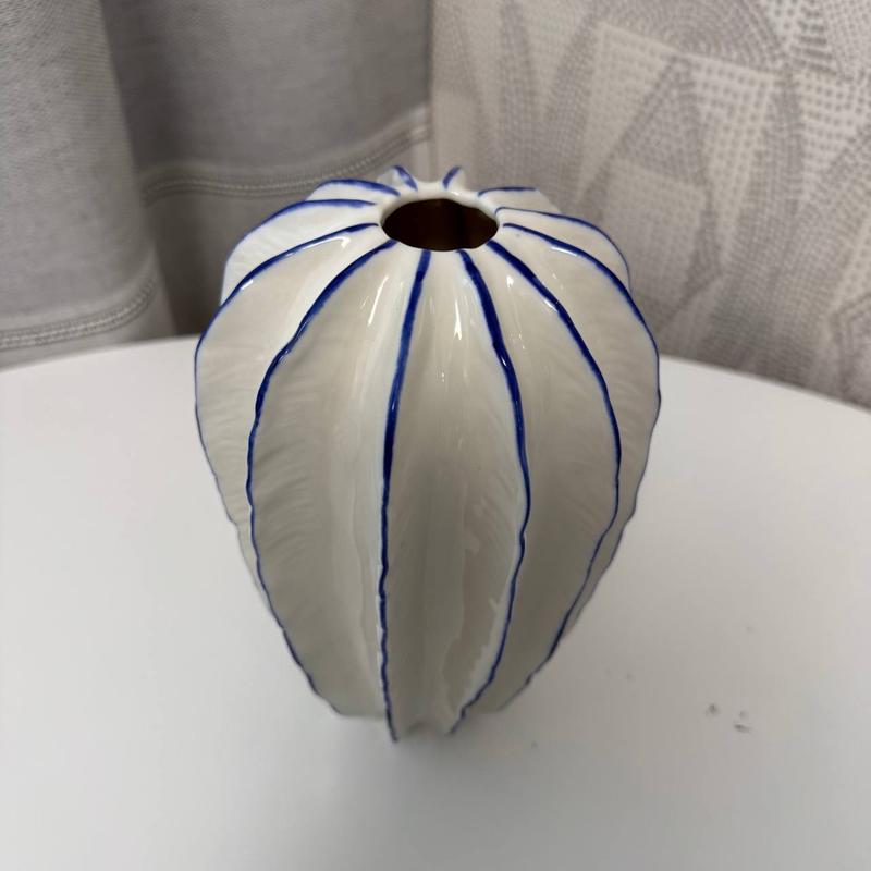Яскрава акцентна ваза у формі карамболя в білому кольорі з синіми деталями. Її незвична форма й насичені відтінки стануть оригінальною прикрасою будь-якого інтер’єру. Чудово підходить для квітів чи як самостійний елемент декору. Така ваза додає простору свіжості, стилю та енергії