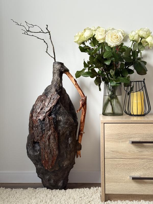 Велика напольна ваза,виплачена в техніці папʼє-маше з додаванням ручки та кори сосни.Тільки для сухих та стабілізованих квітів