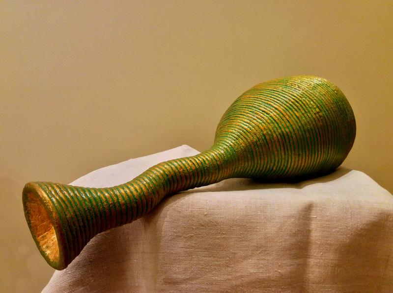 Ваза из тыквы декоративная. Изготовлена из высушенной тыквы. Наружная поверхность вазы оплетена джутовым шнуром для придания жесткости и тяжести. Разрисована красками и покрыта лаком. В вазу можно ставить сухоцвет, колоски или ветви. Размеры: 49 х 16 х 17 см, диаметр дна-10см, диаметр горла-8 см. Очень эффектно смотрится в интерьере