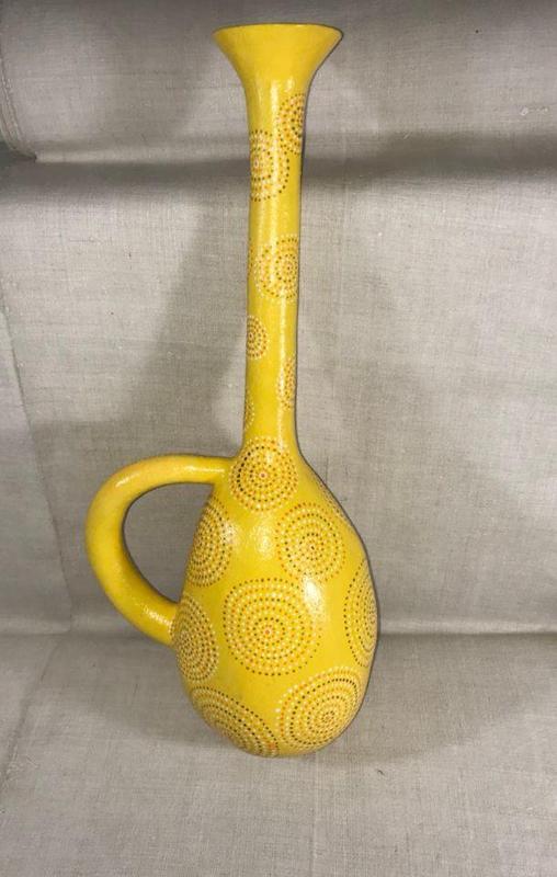 Ваза виготовлена з засушеної гарбуза, поверхню розписана і покрита лаком. Вазу гарбуз можна використовувати для інтер'єру та декору. Можна вставити у вазу сухостій, колоски, воду наливати не можна. Розміри: 46 см Діаметр підстави і горловини – 7 см