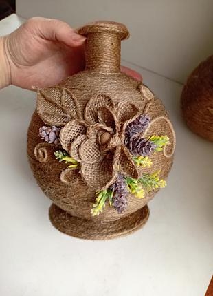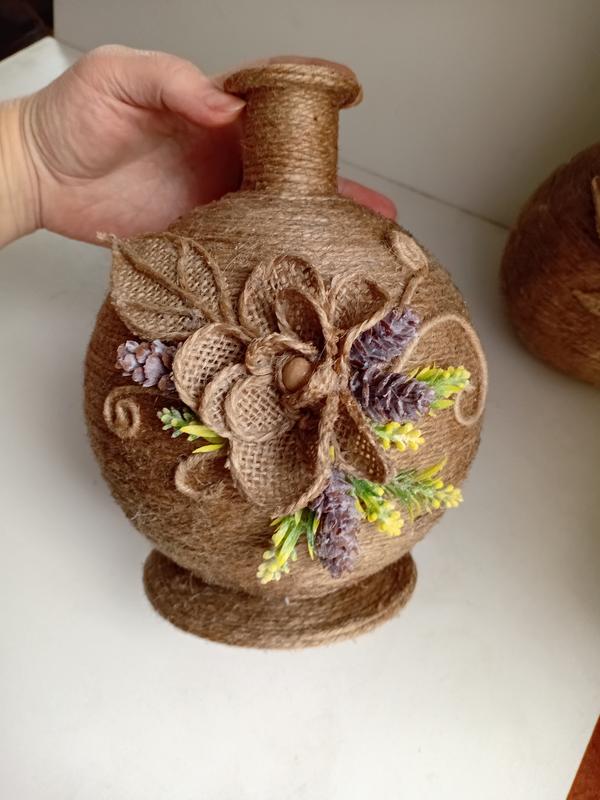 Декоративная джутовая ваза ручной работы. В наличии и на заказ в любых вариантах форм и отделки. Высота изделия -22 см. Основа - пластик.