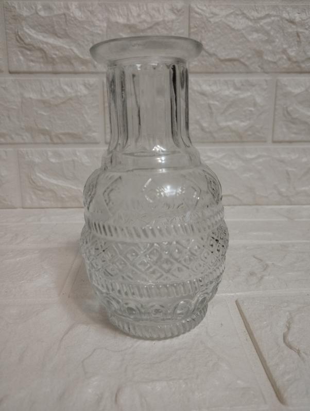 Стеклянная мини-ваза с рельефным узором Продам изящную вазу для одного цветка (bud vase) или декоративный мини-графин. Выполнена из качественного прозрачного стекла с объемным геометрическим орнаментом. Идеально подойдет для создания уюта в интерьере, сервировки стола или в качестве реквизита для эстетических фотосессий. Материал: прозрачное стекло с тиснением. Стиль: винтаж, бохо, шебби-шик. Состояние: идеальный, без сколов и трещин. Использование: для цветов, сухоцветов или как графин для напитков/настойок. Высота 13 см.