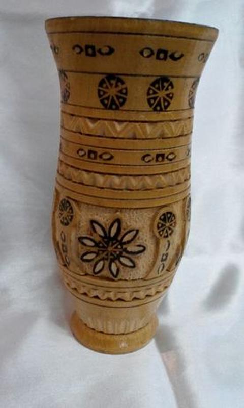 Деревянная ваза с резным рисунком. Материал изготовления вазы – ясень. По окружности вазы декоративный орнамент. Высота вазы – 18 см. Диаметр вазы – 8 см. Цена за 1 шт.