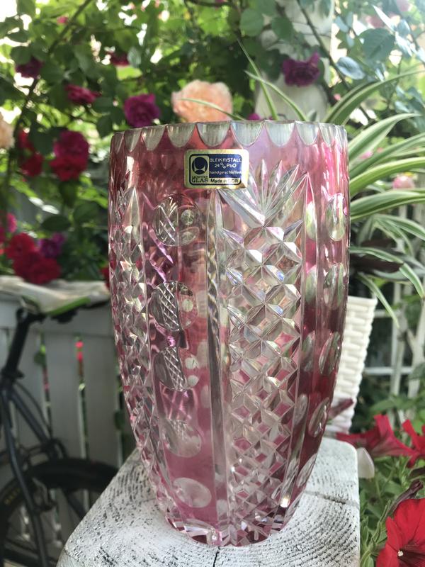 Справжній німецький кришталь найвищої якості.Ваза для квітів в ідеальному стані, з биркою{зроблено в НДР}. Двошаровий кришталь, ручна ограновування. Вінтаж!Висота вази-20см, верхній діаметр-10,5 см
