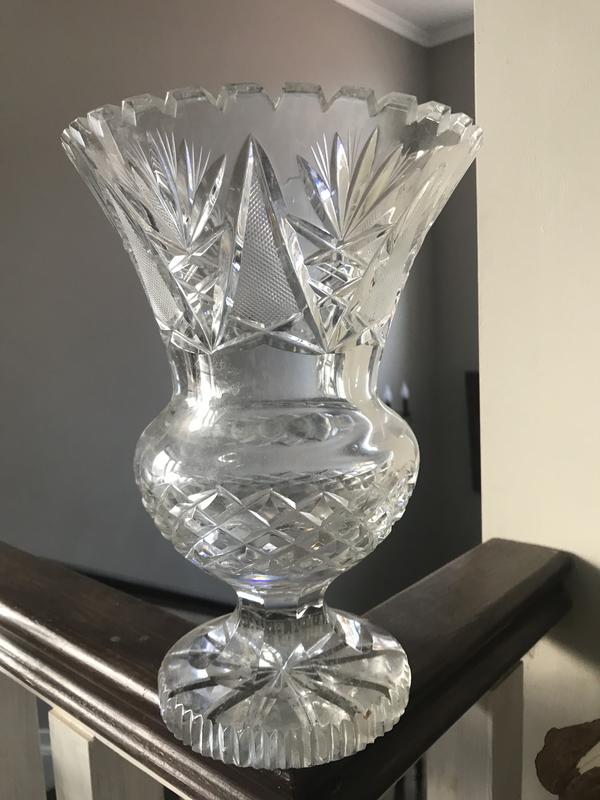 Настоящий немецкий хрусталь высочайшего качества. Шикарная ваза для цветов. Резная, толстостенная. Ваза очень тяжелая. Есть следы времени-незначительный скол по верхней кромке ., что учтено в цене изделия. Шикарная!