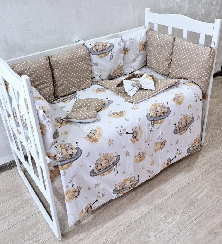 Набор в детскую кроватку💞 Описание:⬇️ 1.Захист 12 подушок 30х60 2. Простынь на резинке 60х120 3. Подушка -бабочка 4. Активце 110х110 5. Пододеяльник 110 х 110 6. Бант с резиночкой