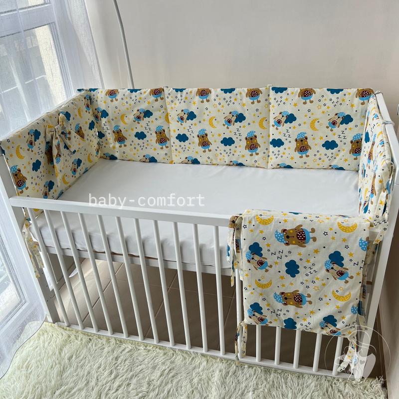 Бортик в кроватку детскую будет отличной защитой от ударов для малыша. Пошитый из натурального хлопка. Подходит на кроватку размером 120*60 см, крепится с помощью завязок на 4 стороны кроватки.