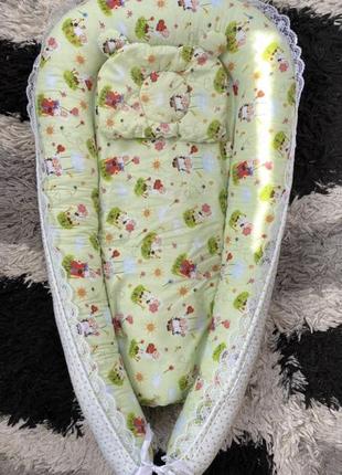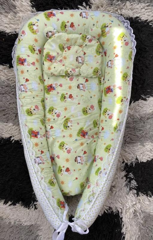 Характеристики: - Гніздечко дає малюкові відчуття комфорту та захищеності; - Забезпечує можливість спільного безпечного сну малюка з батьками; - Використовувати колиску-гніздечку для новонароджених можна під час денного та нічного сну до досягнення дитиною 6-місячного віку; - Позиціонер також можна встановлювати в ліжечко або в люльку для новонароджених; - З ростом малюка бантик можна розв'язати, що продовжує термін експлуатації до 7 місяців. Гніздичко в такому разі перетворитися в бортики на ліжечку; - Подушечка в комплекті - Тканина — 100% бавовна, наповнювач гіпоалергенне силіконізоване волокно; - Розмір ягняти: 90*50 см; - Розмір спального місця 75*35 см. Шилися по індивідуальному замовленню. Дуже класна і пртрібна річ для новонародженого.