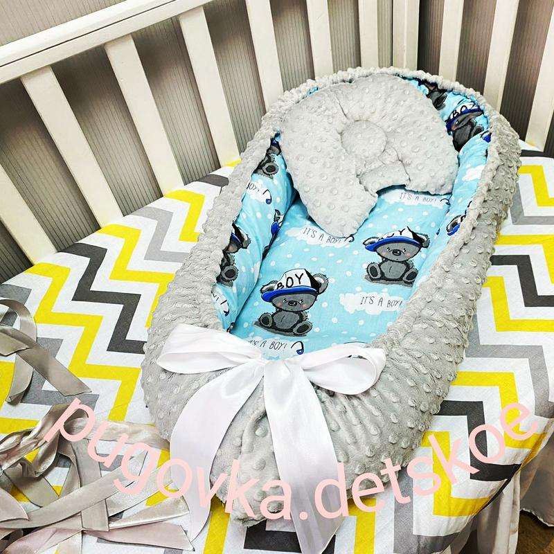 Затишний кокон з подушкою для новорожденого. Матеріал верху: бавовна, наповнювач матраца - синтепон, бортиків - холофайбер. Розмір спального місця 62*30. Можливий пошив у інших кольорах. Швидка доставка.
