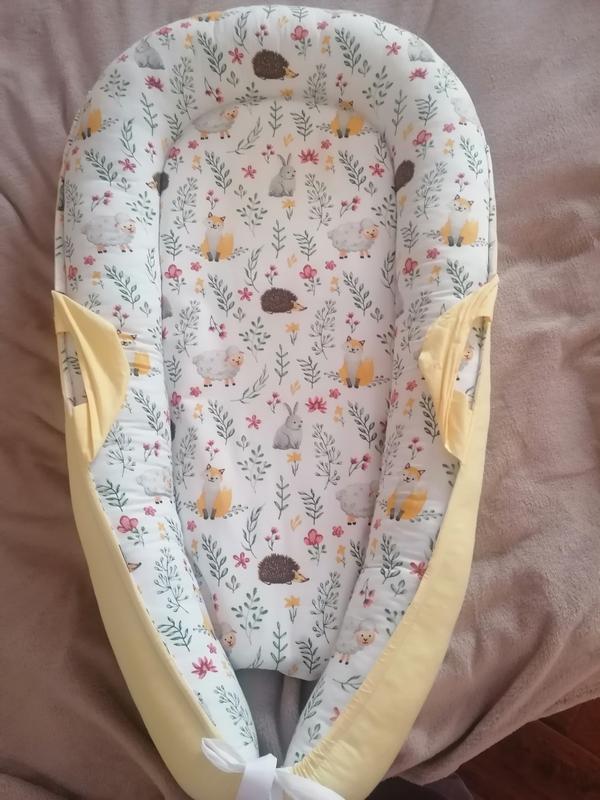 Милый кокон для малыша. Пользовались всего месяц, быстро выросли. Удобный.есть застежка, чтобы вытащить матрасик и постирать кокон. На последнем фото видно пятнышко от смеси,поэтому отдаю намного дешевле