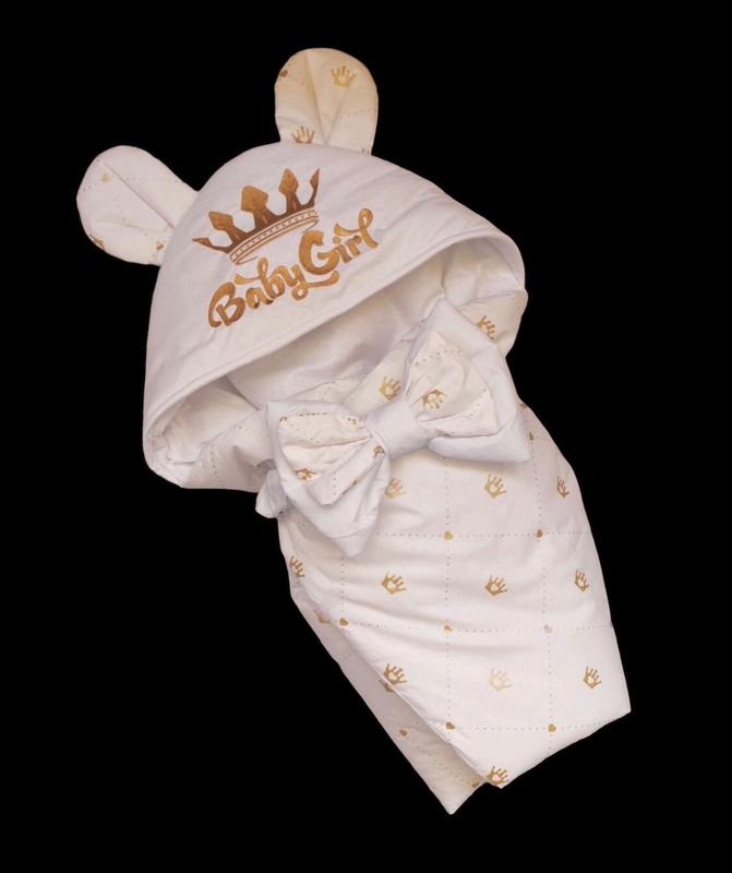 Конверт-ковдра для новонароджених на виписку з пологового будинку - багатофункціональний, зручний, виготовлений з натуральних матеріалів, гіпоалергенний. Ущільнений невеликим шаром утеплювача (силіконізоване волокно, виготовлене за новими технологіями, рекомендоване для новонароджених), який приємно зігріває малюка, а тканина легко пропускає повітря, зберігаючи комфортні та приємні відчуття всередині конверта. Куточок-капюшон для голівки декорований вушками "Міккі Мауса". Конверт фіксується липучкою та еластичним паском з бантом, який м'яко облягає та не сковує рухи. Розмір конверта: 80*80 см.