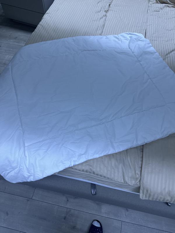 Колдочка детская с постолью и бортиками в детскую кроватку. На постели есть несколько пятен, которые не отстирываются назад напоминающую ее вместе с одеялом в подарок. Одеяло размером 90 на 125 см, наполнитель полиэстер, внешняя ткань - коттон.