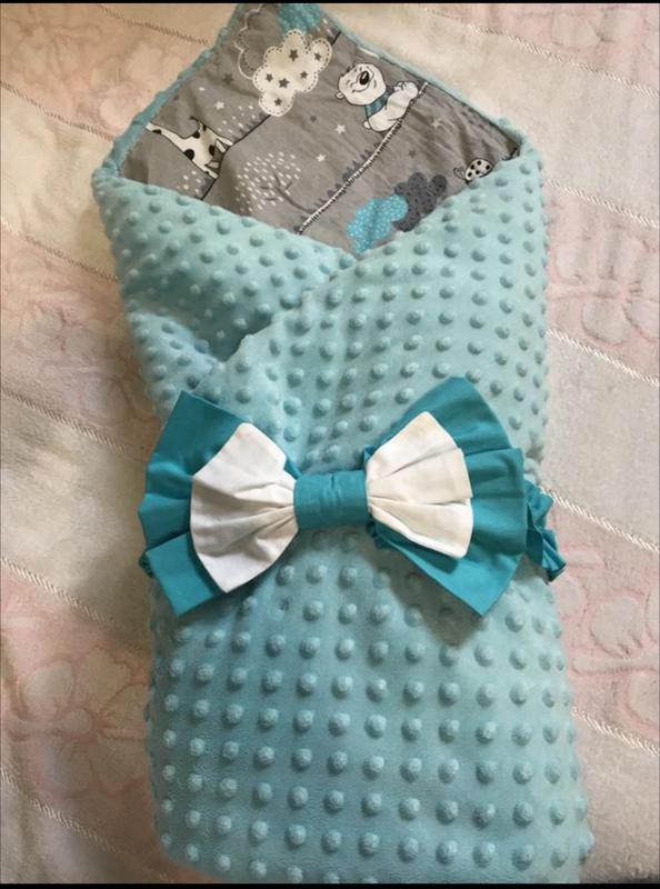 Очень красивое демисезонное одеяло с хлопка и минки плюша Внутри съёмный утеплитель с синтепона Летом используется без, зимой с утеплителем Также одеялко трансформируется в конверт для выписки, в комплекте бант Размер 90*75 см В идеальном состоянии!