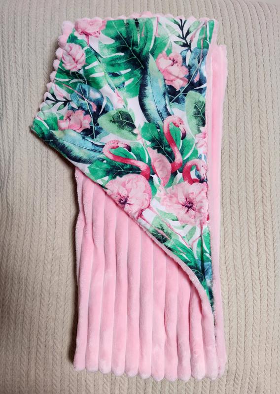 Дитяча ковдра: з одного боку плюш, з другого - бавовна Розмір 95*75 см Є до ковдри: - простирадло на резинці з тієї ж тканини (фламінго) на матрац 70*40 см - 50 грн; - простирадло на резинці з непромокаючої махри на матрац 70*40 см - 50 грн