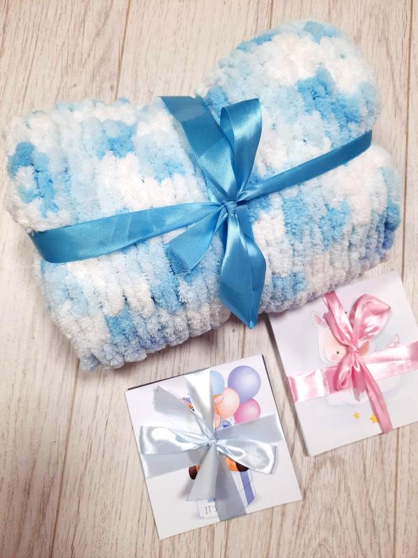 пряжа гиппоалергенная, дуже м'яка і приємна на дотик - ідеально підходить для новонароджених дітей і дітей старшого віку і, звичайно ж, і для дорослих))) Виконуємо пледики будь-якого розміру і будь-якої колірної гами. Найменший пледик для новонародженого - 550 гр. Далі залежить від розміру та візерунка . Склад 100% микрополиэстр - це синтетична пряжа, яка володіє відмінними характеристиками - вона легка, але при цьому відмінно тримає тепло, не викликає алергії.