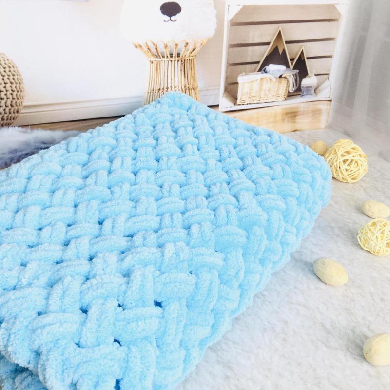 Вязанный детский плюшевый плед ручной работы \ детский плед голубой