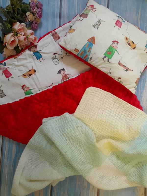 Комплект красивый для малыша, плед вязаный+. комплект подушка и одеяло. Есть пятна, убрать не пробовала. Использовали в коляске