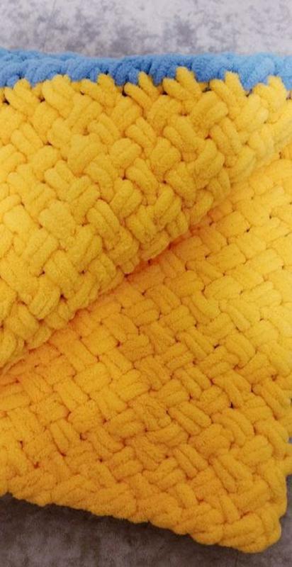 М'який тепленький плед в патріотичних кольорах з гіпоалергенної турецької пряжі Alize Puffy. Ручна робота. Підійде в дитяче ліжечко, в каляску, в саночки. Розмір - 80×90. Також в'яжу пледи на замовлення - колір і розмір на Ваш вибір.
