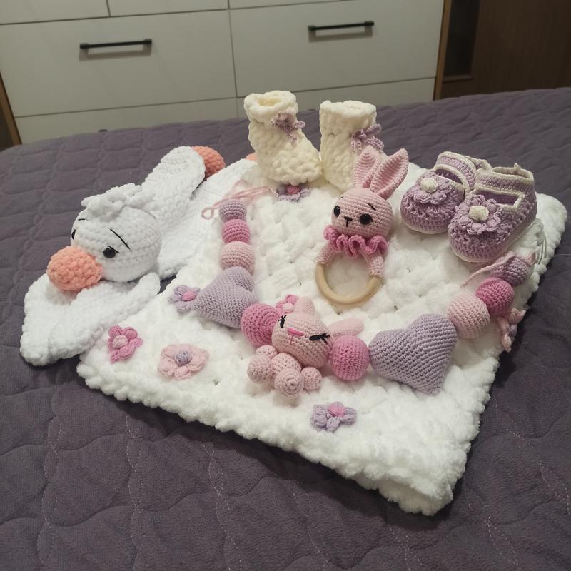 Набор включает в себя нежно мягкий плед украшен цветочками, волшебную игрушку комфортер, подвеску, которую легко можно закрепить на коляске или галстуке, погребушка и две пары пинеток. Подарочный набор также можно заказать в других цветах, а также приобрести отдельно! Срок отправки 3-6 дней. отправлю новой почтой и укр-бытой, также возможна оплата наложенным платежей
