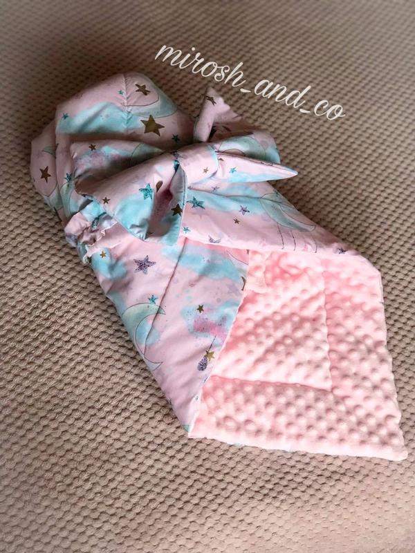 Ковдра для маленької принцеси Где подойдет: в роддомовой на выписку в люльку в кроватку. К одеялу в комплекте идет бант на резинке, для фиксации конверта на выписку. Размер 80x100см Вшитый утеплитель Одна сторона 100% хлопок другая сторона мягкого плюша.