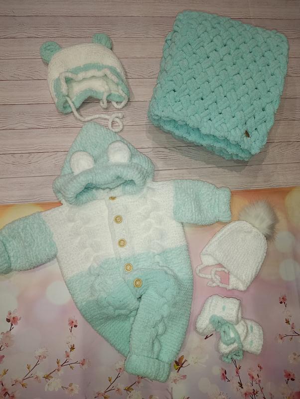 Детские комплекты Ручная работа Размеры 0-3 месяца, 3-6 месяцев, Также под заказ по вашим замерам. Комплект : -плед размер 90*90см -комбинезон - пинетки - шапочка Изготовлено из Турецкой нити Гипоаллергенной 100% микрополиэстер