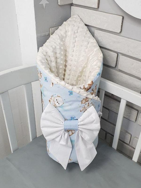 Плед - конверт со съемным утеплителем (внутри утеплитель в чехле) с обратной стороны нежный плюш . Тканина бавовна 100% Размер пледа 100х80 Бантик на резинке чтобы использовать в виде конверт на выписку в комплекті .