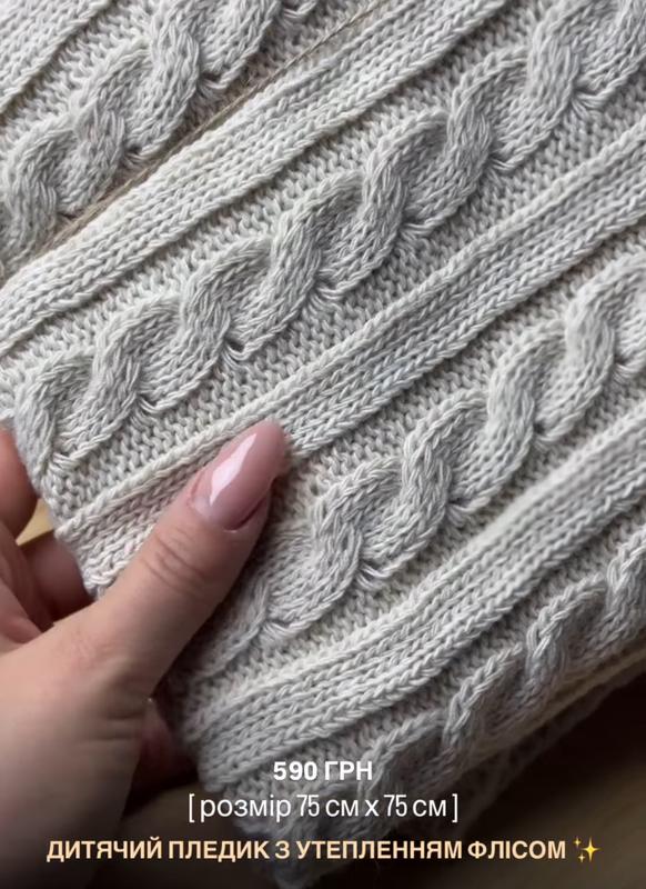 Вязаный детский плед из полушерстяной пряжи, утеплен флисом Отлично сохраняет тепло Размер 75*75см(допустимая разница +- 4 см) Основа - 50% шерсть, 50% акрил; подклад - 100% полиэстер (флис)