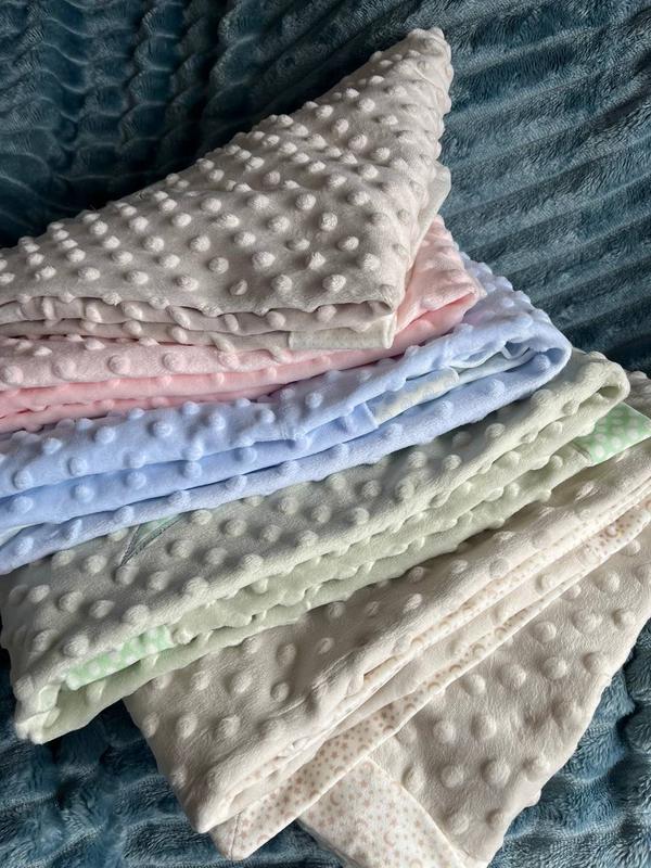 Дитячий плед Minky | 70×100 см Неймовірно ніжний двосторонній плед з фактурними пупирцями — ідеальний для вашого малюка. 🧸 Один бік — м’яке плюшеве Minky з об’ємними пупирцями, другий — гладенький, для ніжного контакту зі шкірою. 👶 Підійде для колиски, візочка, ліжечка або як ковдрочка в дорогу.