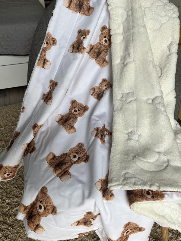 Дитячий молочний плюшевий пледик з ведмедиками, двосторонній. Він тоненький, але тепленький. Розмір 100*80, трохи більший. Можна брати на подарунок.