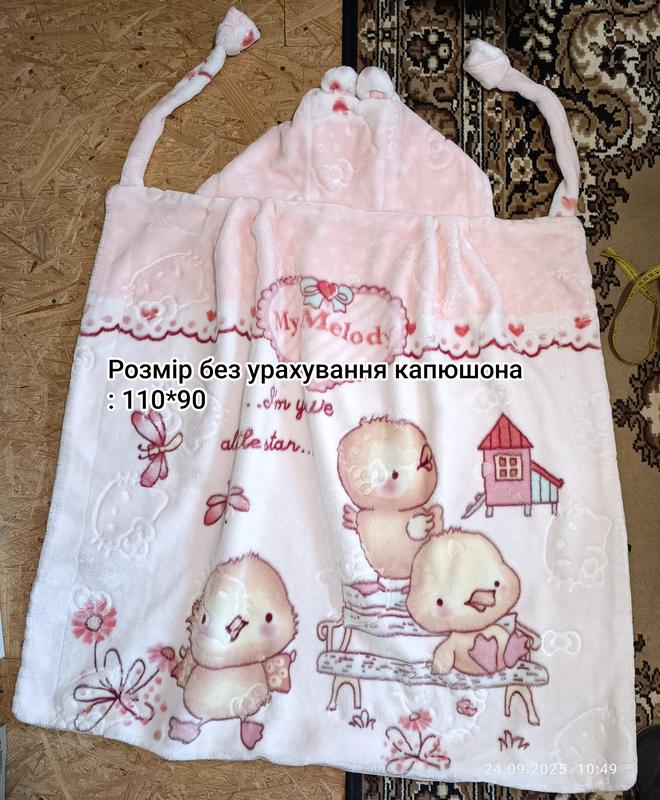 Стан нового. Мягкий плед My Melody с капюшоном и рисунками цыплят. Это детский плед-полотенце с капюшоном, украшенный персонажем Sanrio My Melody и изображениями цыплят. Плед выполнен в розовых тонах и имеет пушистую текстуру. На нем также есть надпись “My Melody” и “I'm your little star...”. Его можно использовать как плед, полотенце или даже как банный халат для малышей.