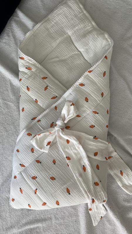 🥕Плед з однієї сторони в морквах, з іншої білий. Бант в морквах 🐇 Підійде як для хлопчика так і для дівчинки 📐Розміри пледика - 100/80, щоб можна було скласти в гарний конвертик, а потім використовувати в якості пледика в ліжечку, або візочку