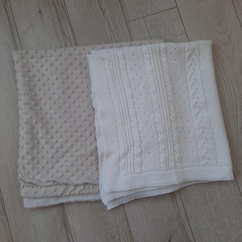 Дитячі пледики вязаний дуже хороший стан, махровий хороший стан колір такий і був ( сіро бежевий) розмір вязаний - 85×80 см мвхровий - 90×85 см ціна за 2 шт