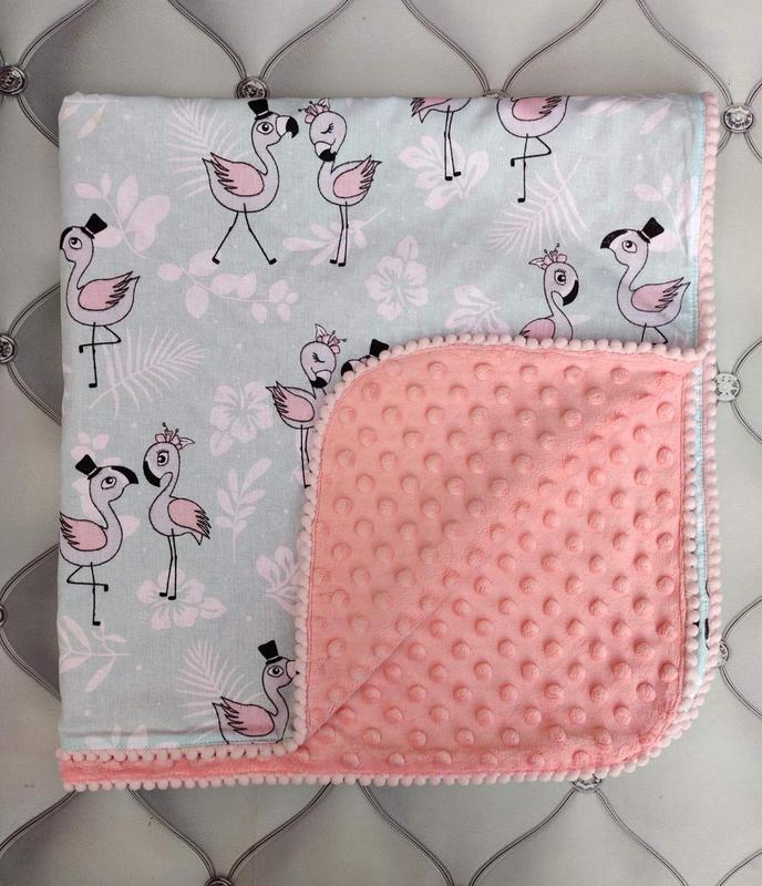 Детский плед фламинго с плюшем, мята с розовым, польский хлопок, 78х78