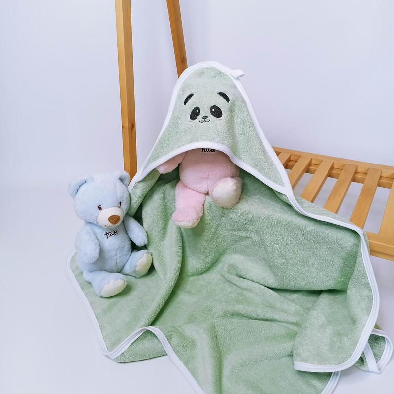 Махровое полотенце с капюшоном после купания для детей с вышивкой зеленое панда махра pene...