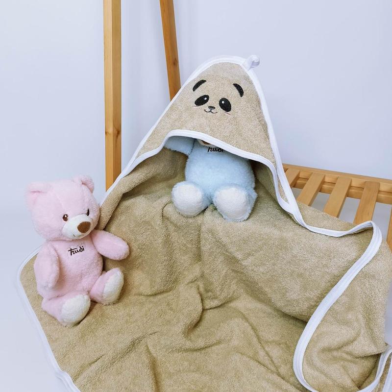 Махровое полотенце с капюшоном после купания для детей с вышивкой коричневое панда махра p...