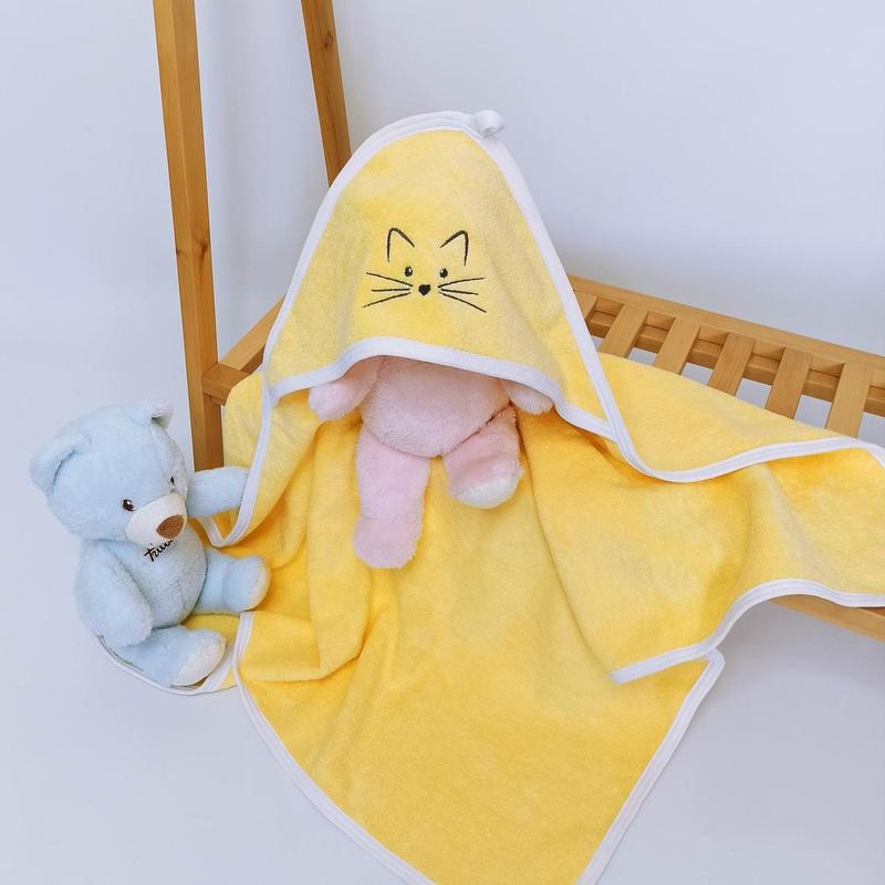 Махровое полотенце с капюшоном после купания для детей с вышивкой желтое кошечка махра pen...