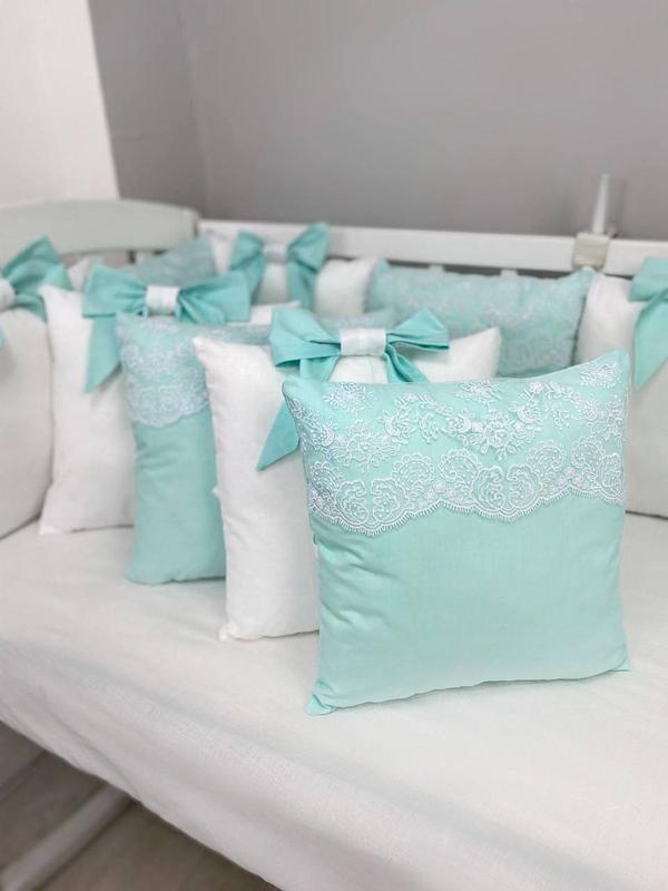 У набір входить: 12 подушок зі знімними наволочками, 6 подушок з ніжним бавовняним мереживом, 6 зі знімними бантиками. Простирадло на гумці по всьому периметру. Підковдра з біссерною строчкою (відстрочений ромбами) з ніжним плюшем, усередині силікон у чохлі. Бантик на резинці та ортопедична подушка. Тканина польська бязь. Натуральне бавовняне мереживо (мереживо може змінюватися на схоже) Ціна з подушками: 1800 грн З косою: 1950 грн