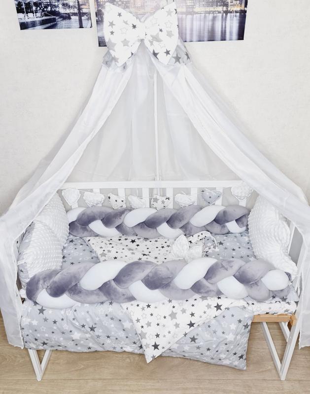 Описание: 1.подушка 40х60см 2.Наволочка на молнии 40х60см 3. Простынь на резинке 60х120 см 4.ковдра 90х110 см 5.пододеяльник на молнии 90х110 см 6.захист (2 подушечки 30х30см на чохлах, 2 коси 120см, хмара) 7.балдахин 8. карман в виде облака 9. Бант с резинкой, чтобы делать конвертом