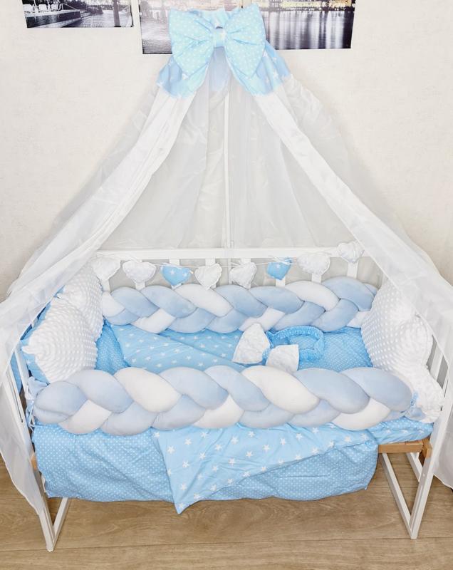 Описание: 1.подушка 40х60см 2.Наволочка на молнии 40х60см 3. Простынь на резинке 60х120 см 4.ковдра 90х110 см 5.пододеяльник на молнии 90х110 см 6.захист (2 подушечки 30х30см на чохлах, 2 коси 120см, хмара) 7.балдахин 8. карман в виде облака 9. Бант с резинкой, чтобы делать конвертом