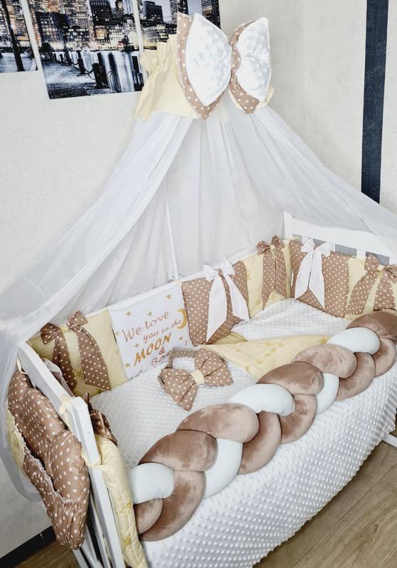 Комплектация ✅Подушка 40х60 см ✅Наволочка на молнии 40х60 см ✅Простынь на резинке 80х120 см ✅Одеяло-конверт на молнии 90х110 см ✅Защита состоит из 8 подушечек + коса ✅Кишеня ✅Балдахин 3,2 м ✅Бант с резинкой для фиксации конверта ✅Материал: Польский хлопок. Наполнитель - силиконизированное волокно