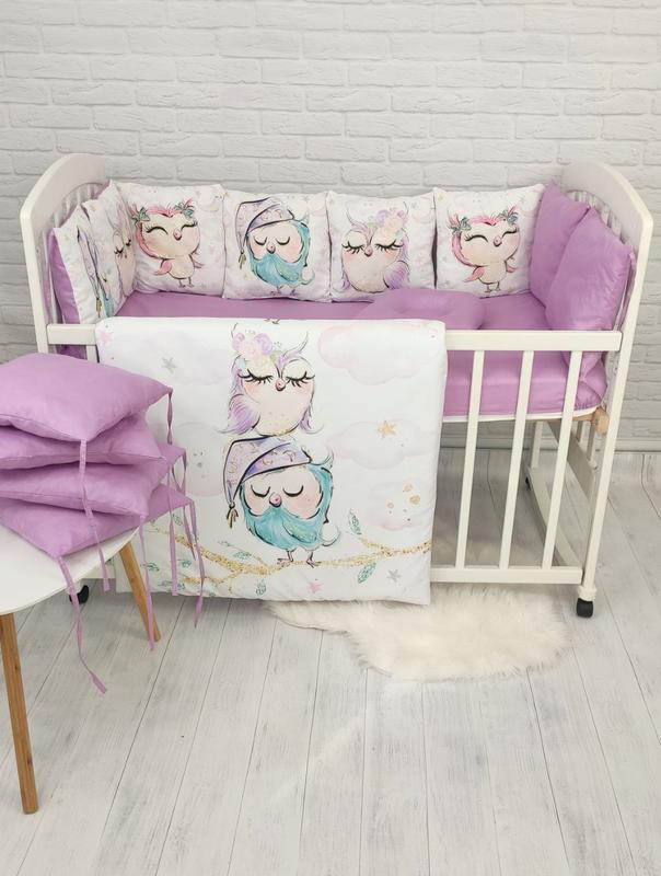 Отличный комплект Премиум качества Комплектация: Бортики из 12 подушечек 6- подушечек - цифровая печать 6- подушечок - тканина однотонна Белый холлофайбер Каждая подушечка фиксируется коттоновыми завязками Ткань - польский хлопок - 100 процентный коттон ортопедическая подушка Одеяло 100 см*80 см на молнии Наполнение силиконизированное волокно Простынь на резинке 120*60 см