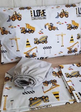 Комплект постели, в детскую кроватку Пододеяльник 105×85,на молнии Простынь на резинке Наволочка 40×60(или 40×50) Ткань: натуральный хлопок (100%). Цвет: Строительная техника+серый однотон. . ➕Есть другие размеры в наличии Пододеяльник 115×90. 135×100. 140×105 . 140×110. 145×110. 160×120. 213×145 Простынь "полуторная" или на резинке, по вашему размеру матраса Наволочка 40×60. 50×70 . 70×70