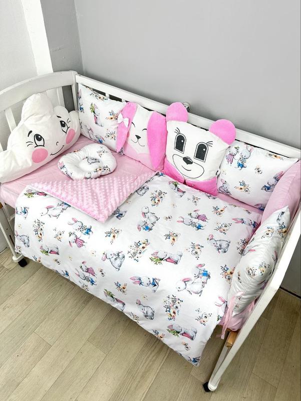 В набор входит: подушки на 4 стороны (размер-30х30) со съемными наволочками внутри наволочки подушечка, простынь на резинке по всему периметру. Одеяло-конверт со съемным утеплителем (размер 100х80), бантик и ортопедическая подушка. Комплект 1700 С косой 1820