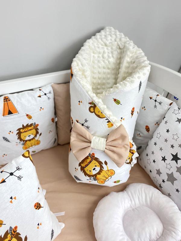 В набор входит: Подушки на 4 стороны цельные (Наволочки не съемные) Одеяло-конверт с бантом и ЗИ съемным утеплителем (силикон в чехле) и плюшем Ортопедическая подушечка и простынь на резиночке. Ткань Турецкая поплин + польский бязь