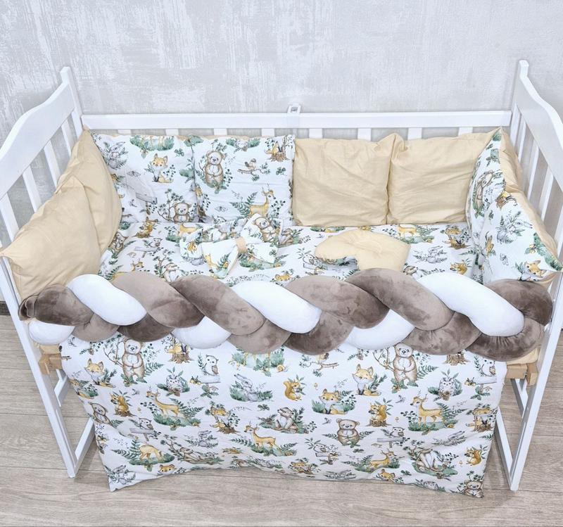Описание: 1. Защита из 4 подушек 30х60 + велюровая коса 120см 2. Простынь на резинке для матраса 60х120 см 3. Подушка бабочка 4. Ковдра 110х110 см 5. Пододеяльник 110х110 см 6. Бант с резинкой Материал: Польский бязь. Наполнитель бортиков холлофайбер белый Одеяло: силиконизированное волокно