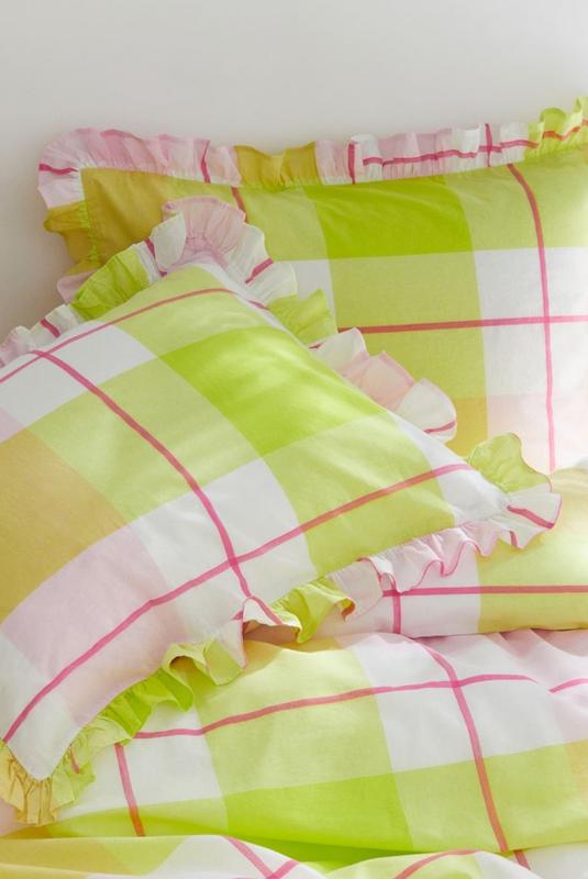 Описание с сайта Описание и размер Двуспальное постельное белье из проверенной хлопковой ткани, выстиранная, чтобы придать ему дополнительную мягкость. Внизу чехла имеется крепление для одеяла с закрытыми металлическими защелками. Две наволочки-конверты обработаны рюшами. Номер товару: 1210326001 Штуки/пари:3 Категория номера: Спальня Описание: Лайм/Розовый / Белый,