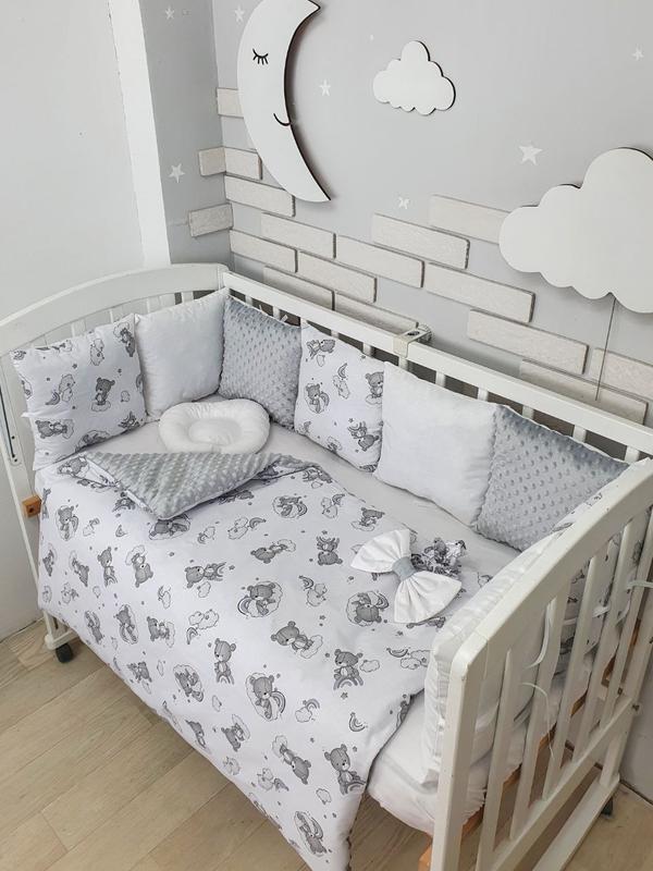 Набор с бортиками в 4 стороны В набор входить: Подушки на 4 стороны цельные, плед - конверт с бантом и со съемным утеплювачем (силикон в чехле), ортопедическая подушка и простынь на резинке