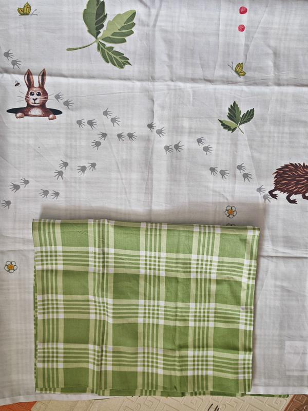 Постель новый детский комплект пододеяльник и наволочка, никогда не использовался. Наволочка зеленая в клетку с обеих сторон, размер 35 на 56 см. Пододеяльник с одной стороны зеленый в клетку, а с другой стороны белый с зайчиками и ежочками, размер 128 на 110 см Простынь отсутствует.